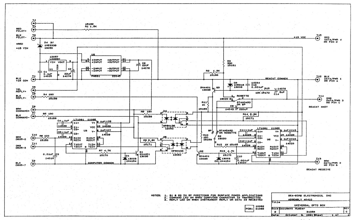 Instruments not equipped with the internal opto-isolated line driver option can receive external power through a data I/O connector with an external power pin which is diode-OR'd with the internal battery supply. Since the 15 volts from the opto box is greater than the normal battery voltage, the instrument will automatically draw power from the SBE 28, not its internal batteries. The Thermosalinograph does not have batteries, so it is always powered from the opto box.