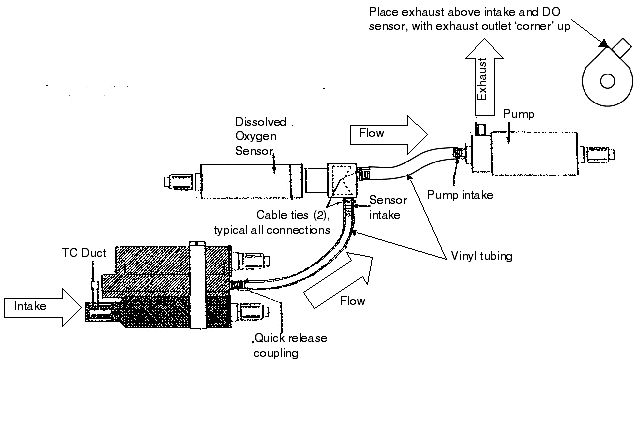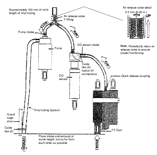- Place a 25 mm (1 in.) long piece of 9.5 mm (0.375 in.) ID Tygon tubing at the DO sensor intake and exhaust. Slide