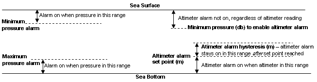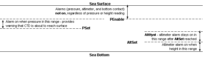 - Minimum pressure to enable alarm (decibars): Set greater than approximately 20 db to prevent alarm from turning on while CTD is sitting on ship deck or entering water (when altimeter is measuring distance to deck or top of water surface).