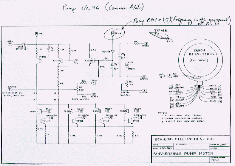 5b. Speed adjustment, Pittman motor. Refer to schematic 30392. Use a counter to monitor the frequency at the blue motor wire (some units have a turret to which the counter can be connected); connect the counter ground to pump power supply (-). The motor speed in RPM will be 30 times the frequency in Hz. If the desired speed cannot be set, change R9 to 2.21K and R16 to 453 ohms (R16 is on the underside of the printed board which will have to be unbolted from the motor for access; apply LockTite to the printed board mounting screws when re-mounting the board to the motor). Adjust the potentiometer to give the desired speed (for example, 100 Hz at the test point for 3000 RPM). Load the motor (using light thumb and finger pressure on the rotating magnet) to increase the current to about 300 milliamperes. If the measured frequency changes by more than about 0.5 Hz, set a lower speed and try again. Note: pumps marked 'WDG #4' or 'WDG #5' may not be adjustable to the speed desired; contact Sea-Bird for further information.