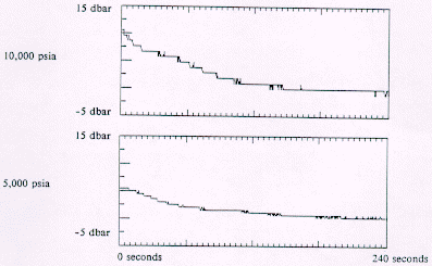 Sensors with 3000-, 5000-, 10,000-, and 15,000-psia ranges exhibit a turn-on transient caused by self-heating of their internal bridge resistors. The transient lasts for approximately 2 minutes, as indicated by the plots below. The plots below show the character of the turn-on transient for 5000- and 10,000-psia sensors. Note also the CTD's pressure resolution limits, which can be seen in the step-wise change in pressure readings. The transient has a magnitude of about 10 dbar (10,000-psia sensor) and 5 dbar (5,000-psia sensor), approximately 0.15% of full scale range in both cases. This proportionality is maintained in all sensors observed to date. Because of their different internal construction, the turn-on transient is negligible in sensors with ranges of 1500-psia and below.