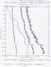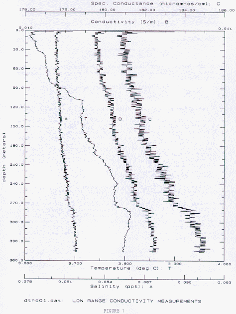 An example of SeaCAT low-range conductivity measurements at Lake Pend Oreille, Idaho, is below (Figure 1). The relatively uniform conductivity signal over the 350 meter profile (trace B) highlights the resolution and noise level of the SeaCAT measurement. Each tick on the conductivity (trace B) and specific conductance (trace C) axes is 1.0 µmho/cm. Digital resolution is 0.15 µmho/cm. The noise level is less than 2 least counts. PSS-78 salinity (trace A) and temperature (trace T) are also included in the plot (generated by Sea-Bird's Seasoft software and printed on a Hewlett-Packard LaserJet II).