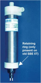 Note: In September 2011, Sea-Bird changed the SBE 5T mechanical design; the new design is easily differentiated from the old design because the new design does not have a retaining ring (see photo below). The old SBE 5T is opened from the end with the retaining ring and bulkhead connector; the new SBE 5T is opened from the end with the pump head. Instructions for disassembly/reassembly of the new SBE 5T pump are identical to those for the SBE 5P pump.