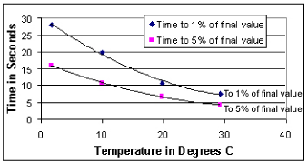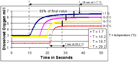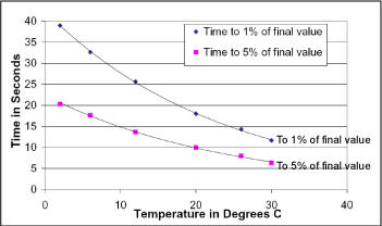 The next plot was derived in a similar fashion, and may be used to determine the time required from power-up and pump turn-on to the availability of an acceptable dissolved oxygen sample with a 1.0-mil membrane. For simplicity, we generally recommend a minimum pump time of 25 seconds for 15 °C and warmer water, and reference the 1% curve below for colder water.