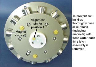 All screws exposed to seawater have been generously lubricated with Bostik's Never-Seez Blue Moly anti-seize compound (available through marine hardware stores). When disassembling/reassembling the Carousel, re-lubricate these screws with Blue Moly or equivalent. Blue Moly is electrically conductive, so be careful not to get it on circuit boards.