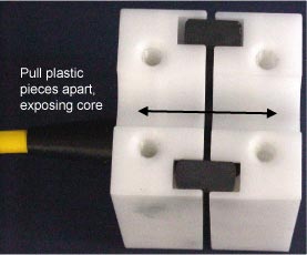 - Reinstall the ferrite core in the two plastic pieces of the clamp, using the 2 Phillips-head