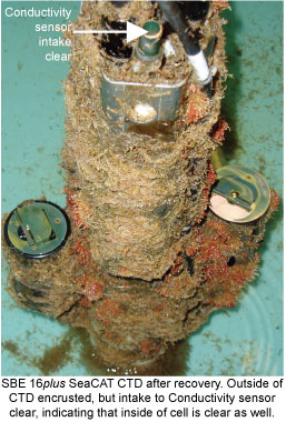 Because moored CTDs are in place for an extended period of time, they are subject to fouling – the growth of marine organisms on and inside the sensors. Fouling is more common in warm surface waters. Sea-Bird moored CTDs use EPA-approved anti-foulant devices to keep the inside of the sensors clean, so that fouling will not affect the measurements.