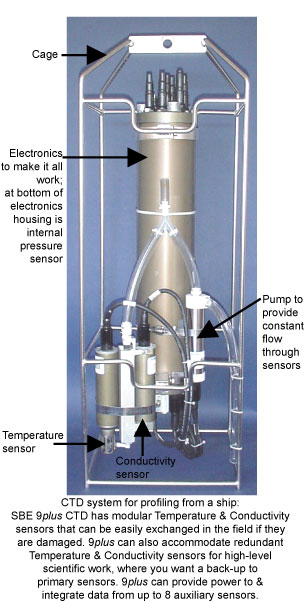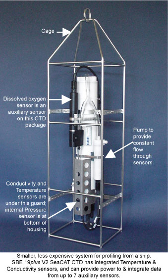 A profiling CTD measures water parameters as it travels through the water, typically lowered over the side of a ship with a winch to take measurements of a vertical column of water. A profiling CTD package often is placed inside a cage, to protect the package from collision with the side of the ship. A profiling CTD package can also include a water sampler that collects samples for later analysis in the lab.