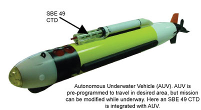 Profiling CTDs can also be deployed in many ways other than being lowered and raised from a ship. They can be integrated with an autonomous vehicle like an ROV (Remotely Operated Vehicle), a glider, or an Argo float that drifts with the currents. The type of vehicle and characteristics of its use dictates the CTD design that will provide the best data; CTDs are not one-size-fits-all instruments, if you are interested in good data.