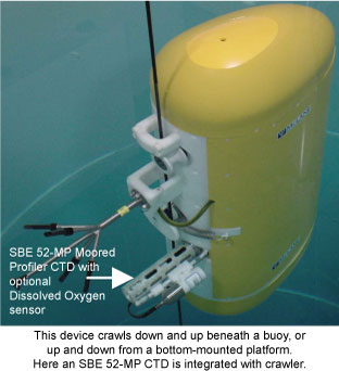 A moored CTD measures water parameters in one location, over an extended period of time, providing a time series of data that can reveal information about seasonal variations in the water, incursion of pollutants into the area (such as an oil spill!), etc. To reduce costs, the pressure sensor may be optional for a moored CTD, because the deployment depth (and therefore pressure) is approximately known. Similar to profiling CTDs, some moored CTDs can be integrated with sensors for measuring additional parameters (dissolved oxygen, turbidity, fluorometer, etc.).