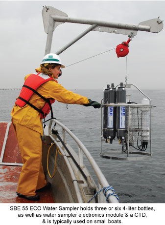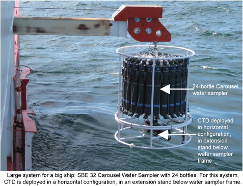 Water samplers are built in many sizes, and the bottles are also available in many sizes. Sea-Bird builds water samplers that can hold bottles as small as 1.7 liters each, up to as large as 30 liters each (0.4 to 7.9 gallons). These samplers can hold as few as 3 bottles, and as many as 36 bottles.