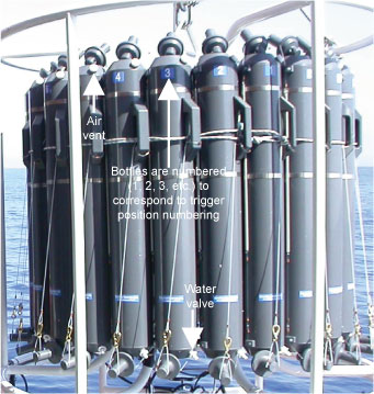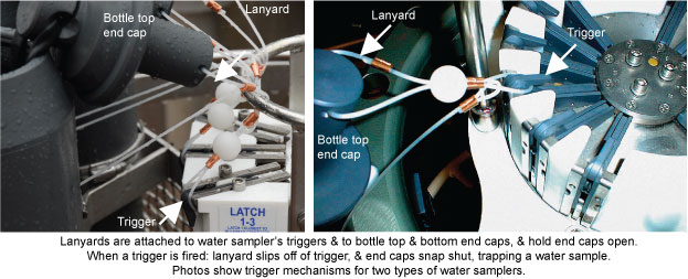 The bottle end caps are connected by a tensioning device, either an elastic cord going through the inside of the bottle or a spring on the outside of the bottle. The water sampler is typically deployed with all the bottle end caps held in the open position by the lanyards, allowing water to freely flush through the bottles. When the trigger mechanism fires, the lanyards are released, and the bottle end caps snap closed, trapping a water sample. Each bottle has an air vent near the top, to allow any air trapped in the bottle to escape. Each bottle also has a water valve near the bottom, for easily removing the water sample when back on deck.