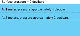 D (Depth): Despite having depth in the name, all CTDs actually measure pressure, which is not quite the same thing. The relationship between pressure and depth is a complex one involving water density and compressibility as well as the strength of the local gravity field (a function of the latitude). In oceanography, pressure in a body of water is measured in decibars; the pressure at the surface of the water is 0 decibars. As an approximation, each 1 meter depth of water (3.28 feet) is equivalent to 1 decibar (for example, the pressure is 10 decibars at 10 meters depth).