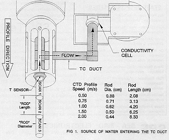 The flow characteristics of this system are well understood. Water that enters the TC duct comes from a cylinder (or "rod") centered just below the duct. The volume of this rod is set by the volume flow rate of the pump and the dimensions of the rod are determined by the CTD profiling speed as shown in the adjacent table. Rigorous analysis is complex, but the concept may be understood by the following argument: If the pump draws water into the TC Duct at exactly the CTD profile speed, then water entering the duct must come from a cylinder of water having a diameter exactly equal to the ID of the TC Duct intake (0.4 cm). The CTD in this case draws in new water at just the rate that its downward movement is causing new water to be presented. At any other profile speed, the "rod" diameter will become larger or smaller to maintain the 30 ml/second volume demanded by the pump.