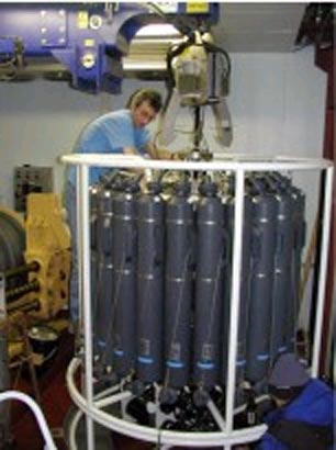 Brooke Ocean has developed a load latch for CTD work. The latch, integral with the overboarding sheave, latches onto a special disc bolted to the SBE 32 Carousel. The latch arms are spring loaded and automatically latch when hoisting. Limit switches interact with the hoist winch to stop hoisting. Releasing the load starts with raising the load up off of the latch arms, opening the latch arms, and lowering the SBE 32 Carousel. Small hydraulic cylinders are used to open the latch arms, and as a safety feature, provide only enough force to open them when there is no load applied.
