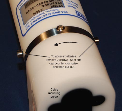Modem end cap and cable mounting guide, opening housing to remove batteries |
