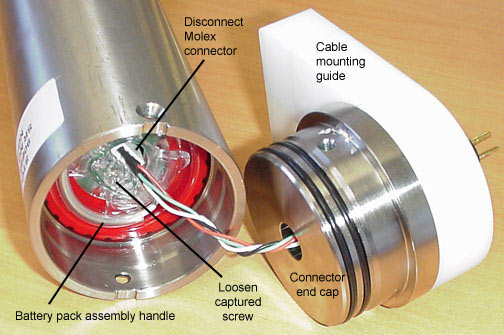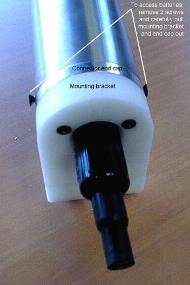 Connector end cap and mounting bracket, opening housing to remove batteries |