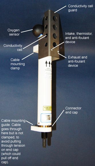 conductivity cell, thermistor, dissolved oxygen sensor, and anti-foulant devices |