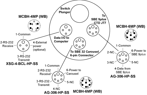 Three bulkhead connectors (CTD, water sampler, computer) are mounted to one end cap, which is not removed except for service. The other end cap is easily removed for battery replacement.