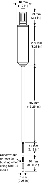 The thermometer's digital output can be displayed in real-time and logged to a computer file. The SBE 35 is standardized in water triple point (TPW) and gallium melting point (GaMP) cells, following the methodology applied to a standards-grade platinum resistance thermometer (SPRT). Unlike SPRTs, it does not require an expensive resistance bridge, making the SBE 35 a dramatically cost-effective alternative. For measurements in fixed point cells, the protective guard is removed and a brass and plastic tip bushing is attached to give the SBE 35 the length, diameter, and thermal averaging characteristic of an SPRT. The SBE 35 resolves temperature in fixed point cells to approximately 0.000025° C (25 µK). Accuracy is better than 1 mK.