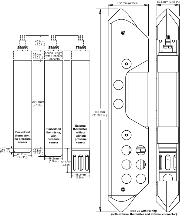 A standard SBE 39 is supplied with embedded thermistor, internal connector, and plastic housing for depths to 600 meters. Options include: