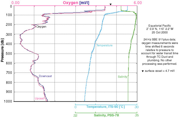 Hysteresis is largely eliminated in the upper ocean (1000 meters) due to improved temperature response. Residual mismatch between up and down casts in this part of the ocean is due to sensor alignment, correctable in post-processing. At higher pressures, changes occur in gas-permeable Teflon membranes that affect their permeability characteristics. These changes have long time constants, depend on the sensor's time-pressure history, and result in hysteresis at depths greater than 1000 meters. These effects are predictable and are also correctable in post-processing. The resultant SBE 43 measurement resolves oxygen features more precisely, reducing the ambiguity about locking measured sensor values to bottle Winklers.