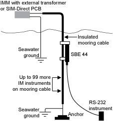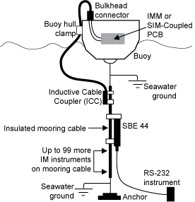 In typical surface buoys it is often preferable to connect the jacketed mooring wire to the buoy with a length of chain, grounding the wire to seawater at each end. An Inductive Cable Coupler (ICC) connects the IMM/SIM to the jacketed wire above the uppermost UIM and below the point where the wire is grounded. |