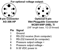 The SBE 50’s optional Voltage Output interface provides 0 - 5 volt output proportional to the pressure or depth, in addition to the RS-232C output. When equipped with the Voltage Output Interface, the SBE 50 uses a 6-pin I/O bulkhead connector.