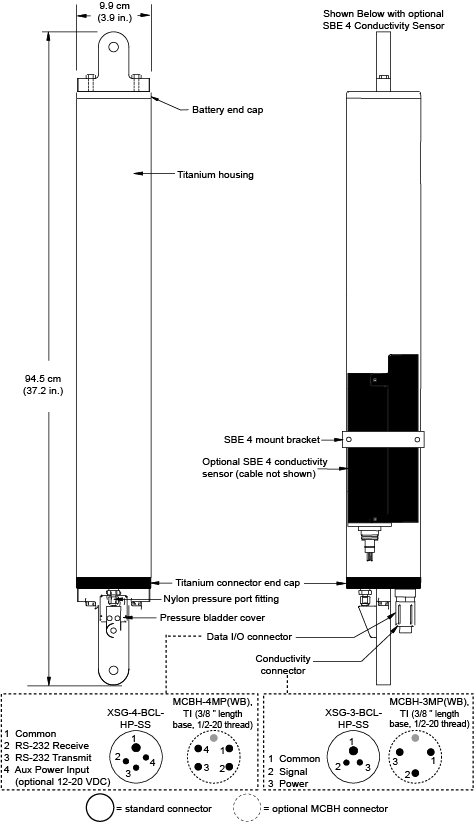 | Pressure | Standard Temperature (°C) | High Accuracy Temperature (°C) optional | Conductivity (S/m) optional | |