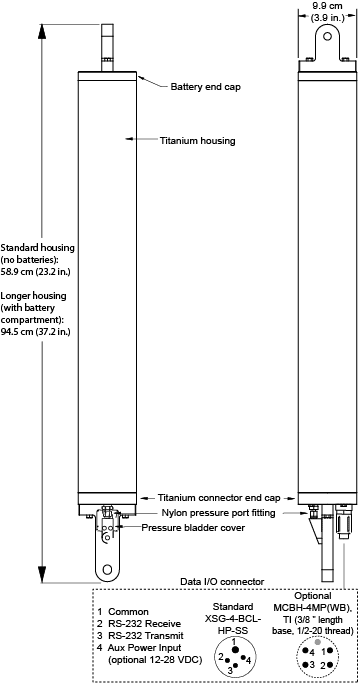 | Weight | With optional long housing and alkaline batteries: 14.5 kg (32 lbs) in air, 8.6 kg (19 lbs) in water |