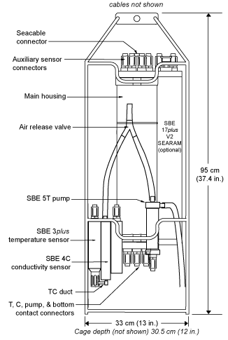 The standard SBE 9plus underwater unit has an aluminum housing rated to 6800 meters (22,300 ft), and is supplied with one conductivity and one temperature sensor (fitted with a TC Duct and constant-flow pump), and an internally mounted, temperature-compensated Paroscientific Digiquartz pressure sensor for 6800 meter (10,000 psia) full scale range. Input channels and bulkhead connectors are provided for an optional second (redundant) pair of temperature and conductivity sensors. Other standard features include an 8-channel, 12-bit A/D converter with differential inputs and low pass filters, and high-power capability for support of commonly used auxiliary sensors (e.g., SBE 43 dissolved oxygen, SBE 18 or SBE 27 pH, transmissometer, fluorometer, ambient light, altimeter), a modem channel for real-time water sampler control, and a port for connection of an optional bottom contact switch. Options include: