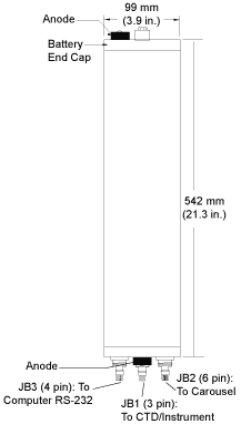 The AFM has an anodized aluminum housing rated to 6800 meters (22,300 feet). Bulkhead connectors for the CTD, Carousel, and Data I/O (RS-232) are mounted on the housing end cap. The AFM is typically installed on the Carousel, with the same mounting bracket used to mount a SeaCAT, and hangs vertically between the upper and lower adapter plates.
