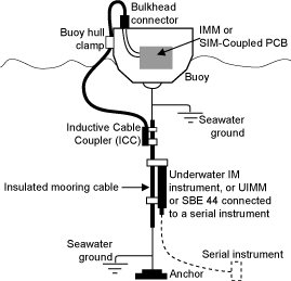 DESCRIPTION The ICC is a link in Sea-Bird’s inductive modem (IM) telemetry systems, used in applications where the plastic-jacketed wire termination is grounded to seawater (at a chain, for example). The ICC clamps to the jacketed mooring wire, and makes electrical connection with the Inductive Modem Module (IMM) or Surface Inductive Modem (SIM) via a cable housed in reinforced-rubber conduit. The conduit’s upper end is fixed to the buoy hull with the provided clamps. The conduit/cable must be long enough to prevent buoy motion from pulling it completely straight and putting tension on the ICC. An IM telemetry system typically includes:
