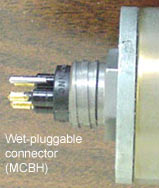 is titanium, regardless of housing option, & is rated for 10,500 m. These options include standard or wet-pluggable bulkhead connectors. Wet-pluggable connectors may be mated in wet conditions. Their pins do not need to be dried before mating. By design, water on connector pins is forced out as connector is mated. However, they must not be mated or un-mated while submerged. Wet-pluggable connectors have a non-conducting guide pin to assist pin alignment (exception: 6-pin connectors) & require less force to mate, making them easier to mate reliably under dark or cold conditions, compared to our standard (Impulse XSG/RMG) connectors. Like standard connectors, wet-pluggables need proper lubrication & require care during use to avoid trapping water in sockets.