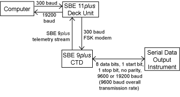 | 9p-11b | Serial Data Uplink, 9600 unidirectional RS-232, with 19200 baud sensor communication interface (requires water sampler modem channel, limits cable length to 8,000 m, prevents GO 1015 interface, & makes 9plus incompatible with SBE 17plus Searam & other 911plus CTDs that do NOT have this option) | |