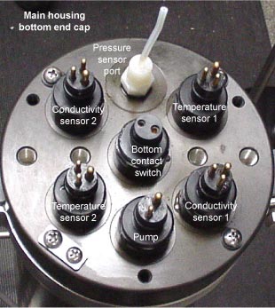 switch does not use one of 8 A/D channels, so system can accommodate switch in addition to 8 auxiliary sensors.Bottom contact switch connector type (standard or wet-pluggable) must match 9plus connector type. Note: In 2007, Sea-Bird began using a female bulkhead connector on 9plus for bottom contact switch, in place of male bulkhead connector. This change was made to differentiate bottom contact switch connector from sea cable connector. See bottom end cap photo above & Application Note 86. |