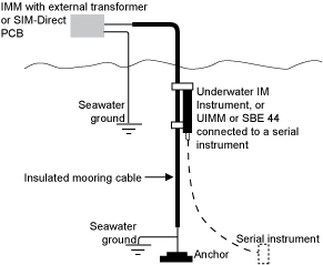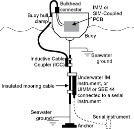 | 41546 | IMM adapter PCB for direct connection method between surface buoy and top of mooring cable (DN 41546). Specify full size or half size board. | Provides external transformer for applications where bottom end of wire is grounded to seawater, & top end remains insulated all way to connection to IMM. Second wire from IMM connects to seawater ground, completing circuit (see drawing above). |