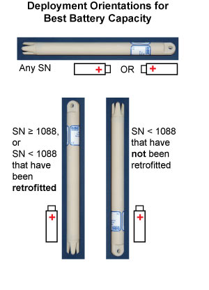 If you require the full battery capacity calculated by SeatermUSB, and must deploy/redeploy the SBE 56 before returning it to Sea-Bird, and deploy it in a horizontal orientation, or thermistor end up (battery button end (+) up).