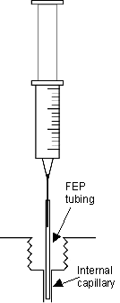 - Fill the internal capillary with oil, slowly pulling the syringe tubing