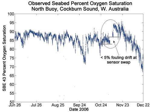 The SBE 43 DO sensors have high initial calibration accuracy, low (non-detectable) electrochemical drift, an effective anti-fouling approach, and a predictable linear response to bio-fouling. Effective anti-fouling defenses maintain a nearly drift-free signal for months, and the predictable character of drift when fouling occurs allows a reliable means of data correction. These characteristics extend the accuracy and useful data life of the sensor, extending the interval between service visits and dramatically lowering the maintenance and data costs of the SBE 43 oxygen sensor. The proven strategy is being used successfully in critical monitoring applications, for example in Cockburn Sound, Western Australia.