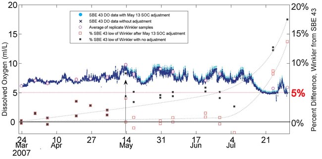 The SBE 43 DO data calculated after May 13 using the NewSOC demonstrate how sensor accuracy is maintained near initial calibration accuracy by using a single quality reference sample to correct the calibration slope. Utilizing this approach can prolong an instrument deployment between mooring service intervals, and reduce service gaps in moored data streams.
