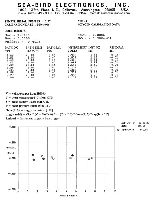 | Figure 1. A typical calibration sheet showing calibration data and derived sensitivity, zero offset, and temperature correction factors. Included is a graphical plot of the residual differences between the sensor computed value and the measured bath oxygen levels. The oxygen levels in the bath are determined by Winkler titrations of bottle samples. |