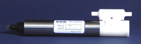 The entire sensor with high pressure housing for electronics and plenum attached. Water to be measured is pumped through the plenum past the sensor head. If needed, poison cylinders (not shown) can be added to the inlet and exhaust ports of the plenum. |