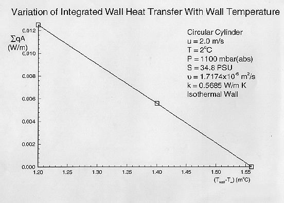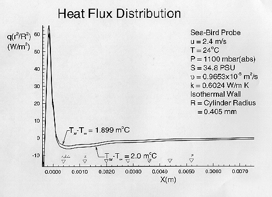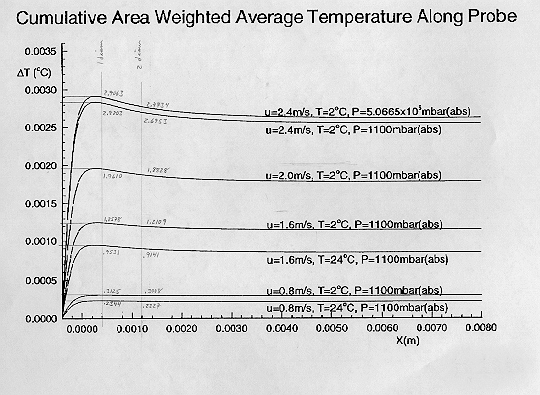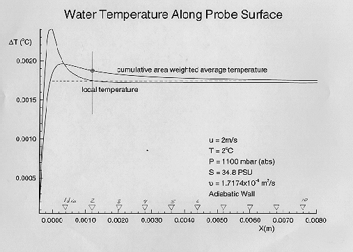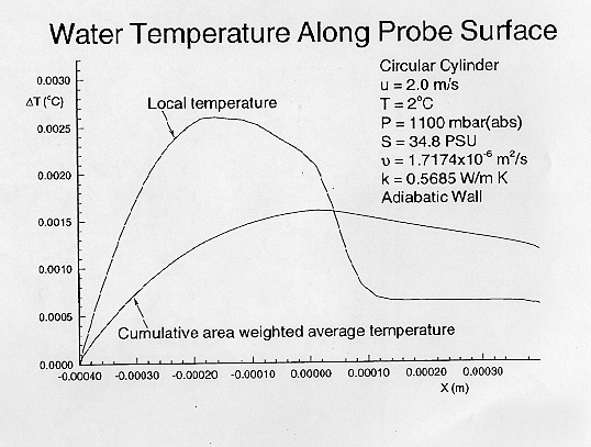 The 'over'-temperature experienced by a thermistor bead inside the metal probe sheath is an average of the surface temperature around the cylinder. The area-weighted average temperature is the second curve (Figure 18) and yields about 1.2 mK above ambient at 2 m/s in contrast to 1.9 mK in the axisymmetric case. The adiabatic wall may not be a good approximation for this flow orientation because heat is likely to redistribute quickly and efficiently along the short circumferential path in the probe metal sheath.