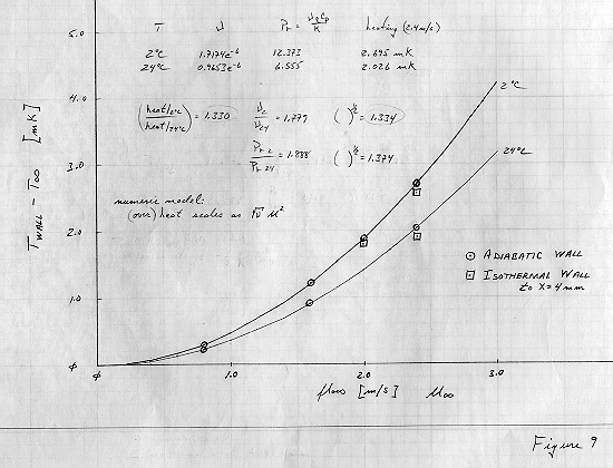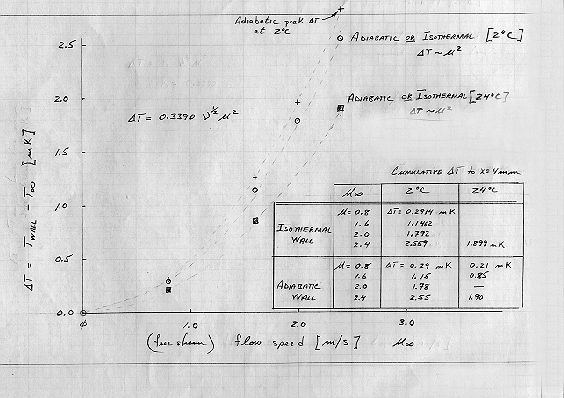 These temperature difference data are then plotted against the reduced flow value and an immediate dependence on velocity and ambient temperature (fluid viscosity) is evident (Figure 23); the symbols are measurements and the curves are U^2 fits to the data.