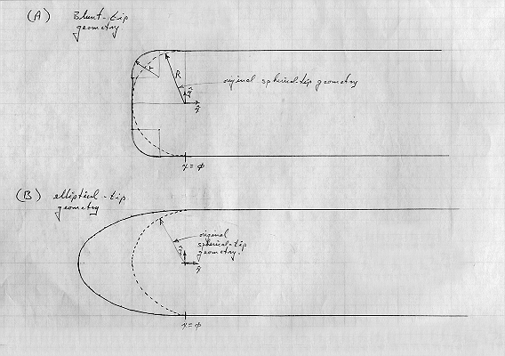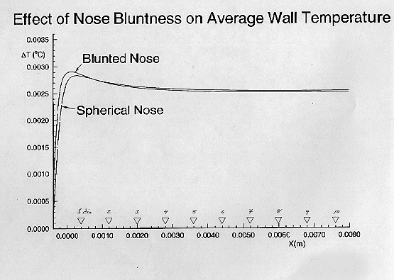 The over-temperature of the probe tip is not very sensitive to tip geometry. Two alternate tip shapes were modeled (Figure 10); a blunted nose (A), and a more stream-lined elliptical tip geometry (B). While the specific temperature distribution at the probe tip is different within the first diameter, the area-weighted average temperatures from all probe shapes agree to better than 5% when averaged 1 or more diameters back from the tip (Figure 11).