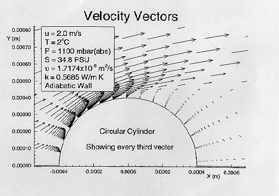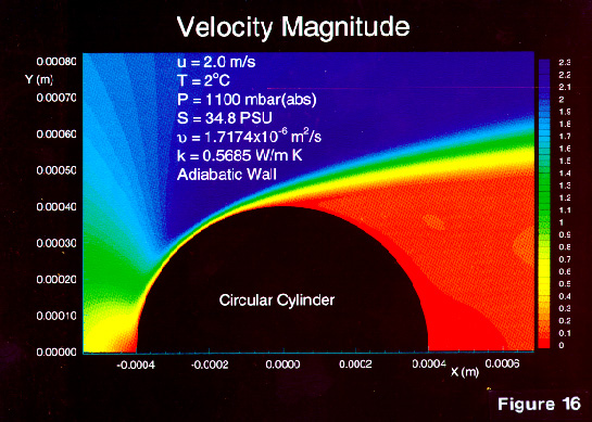 The resulting flow pattern across the cylinder has the anticipated features (Figure 15); a stagnation point, viscous boundary layer structure with flow acceleration and enhanced shear, and a slow recirculation region in the wake of the cylinder.