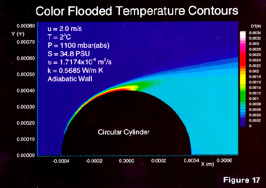 The resulting temperature distribution in the water exhibits very localized heating only under the region of accelerated flow over the cylinder rim (Figure 17).